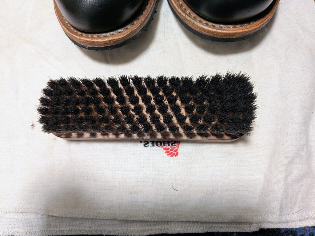 保湿して靴クリーム塗ったら豚毛のブラシで擦って馴染ませます。